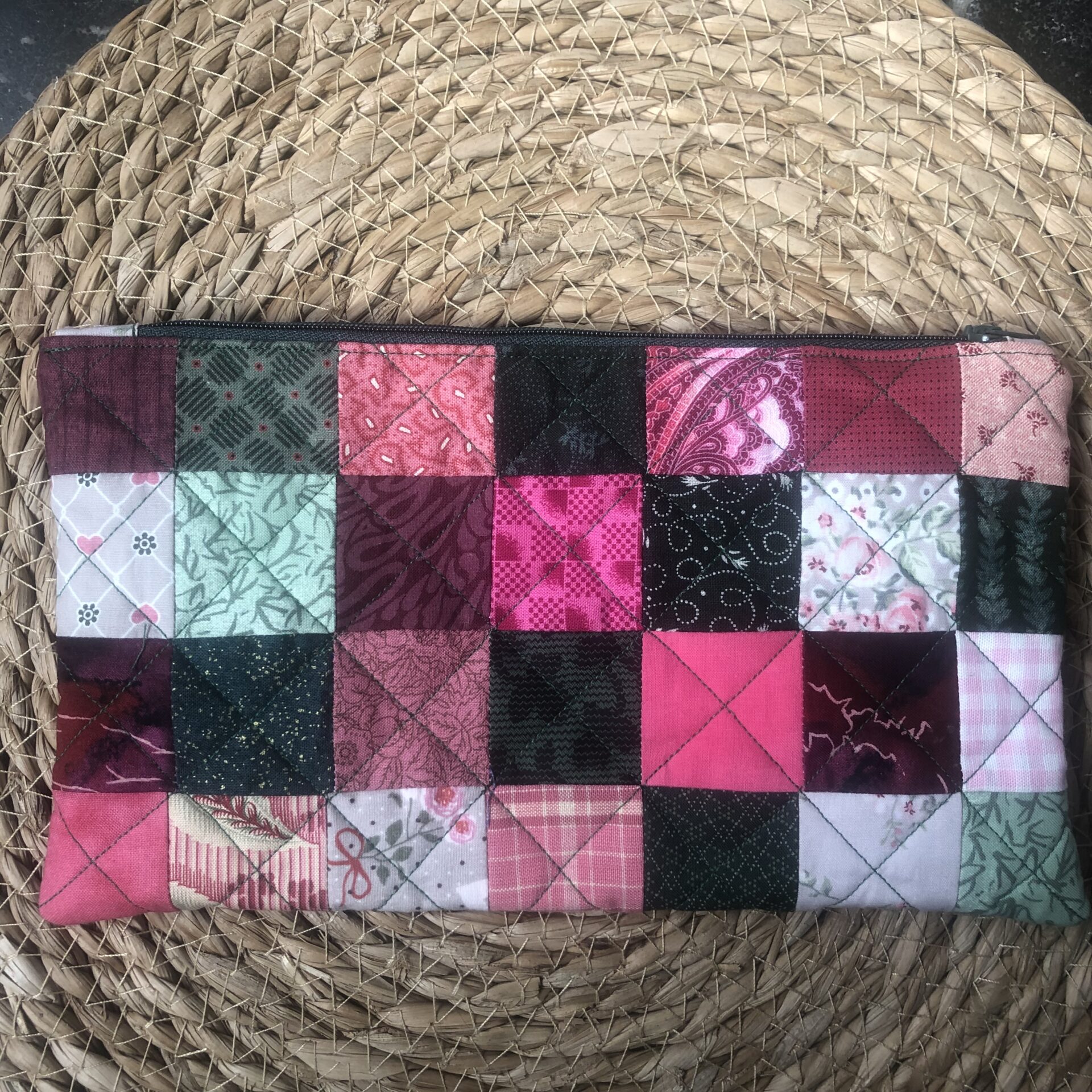 Gevoerde etui met rits van patchwork lapjes. De maat is ca. 24 x 14 cm. De buitenkant is groen/roze en de binnenvoering is lichte kleur katoen met bloemetjes in groen/roze. Leuk voor je pennen en potloden, je make-up voor in je tas of voor een aantal pasjes of wat los geld. Uniek exemplaar, je koopt wat je op de foto ziet.