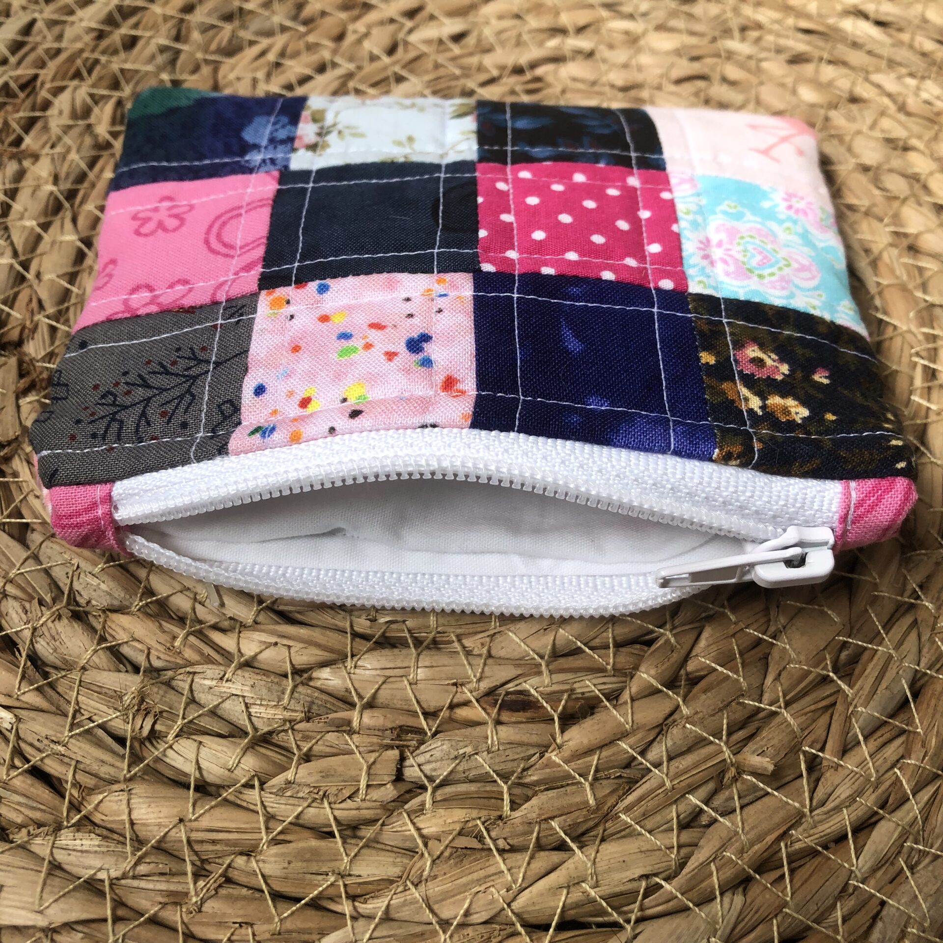 Gevoerd ritszakje van patchwork lapjes. De maat is ca. 12 x 10 cm. De buitenkant is roze/blauw en de binnenvoering is wit. Leuk voor een aantal pasjes of wat los geld. Uniek exemplaar, je koopt wat je op de foto ziet.